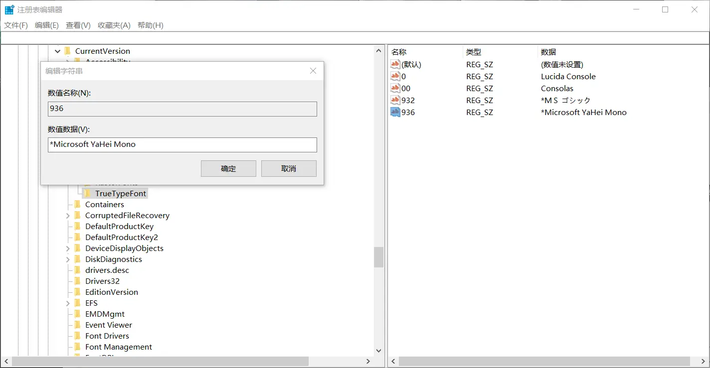 打开注册表编辑器,在 HKEY_LOCAL_MACHINE\SOFTWARE\Microsoft\Windows NT\CurrentVersion\Console\TrueTypeFont 中编辑 936 字符串,将数值数据修改为 *Microsoft YaHei Mono 并保存。