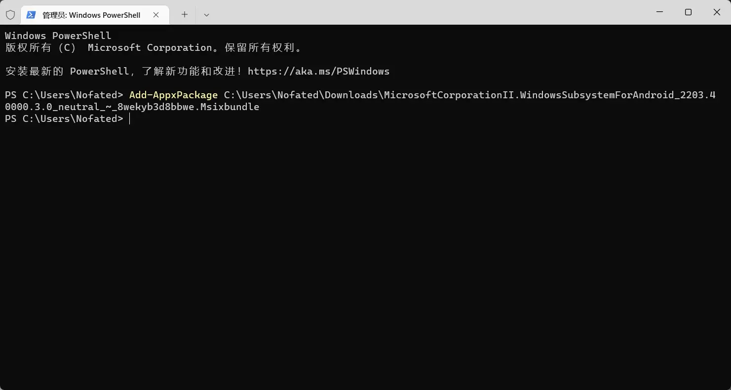 Add-AppxPackage C:\Path\to\MicrosoftCorporationII.WindowsSubsystemForAndroid_2203.40000.3.0_neutral_~_8wekyb3d8bbwe.Msixbundle