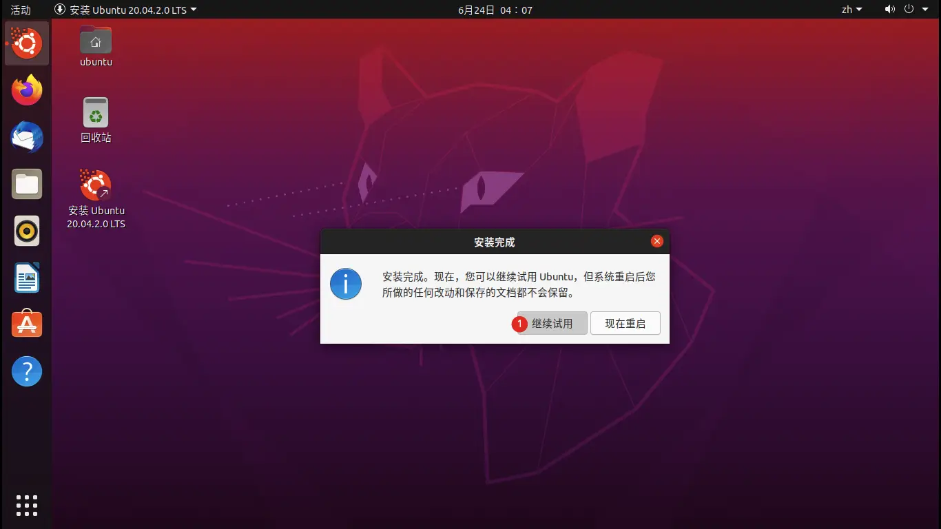 对于 21.04 及以上版本的 Ubuntu,你已经完成了安装,此时可以拔下 U 盘启动到 Ubuntu To Go,但对于 21.04 以下的版本,请参照下面的内容继续安装 grub-efi。